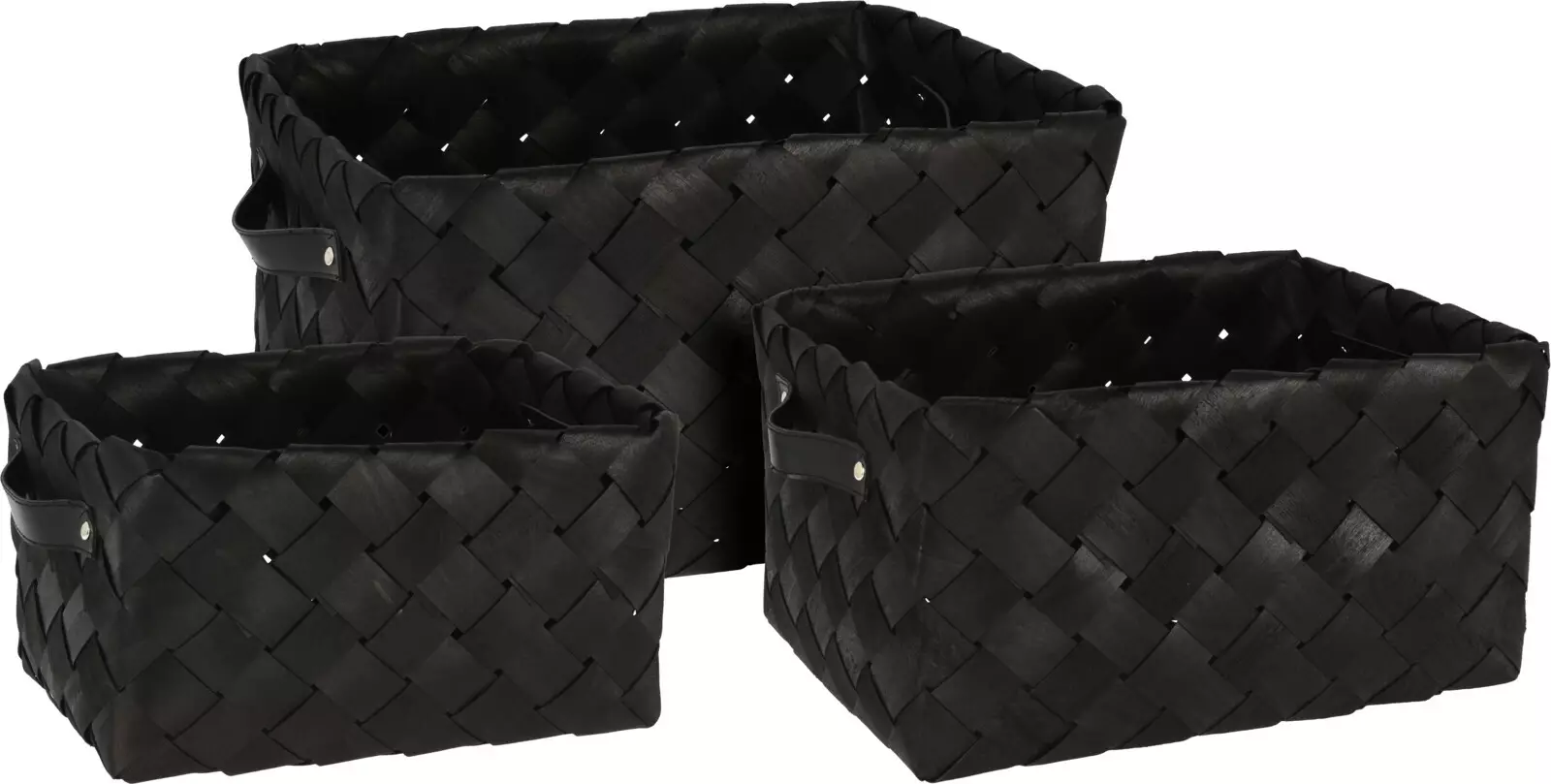 mustat korit nahkaisilla kantokahvoilla Saatavana 3 kokoa: * pieni 29x29x14 cm * keskikoko 33x24x16,5 cm * suuri 37x29x19 cm