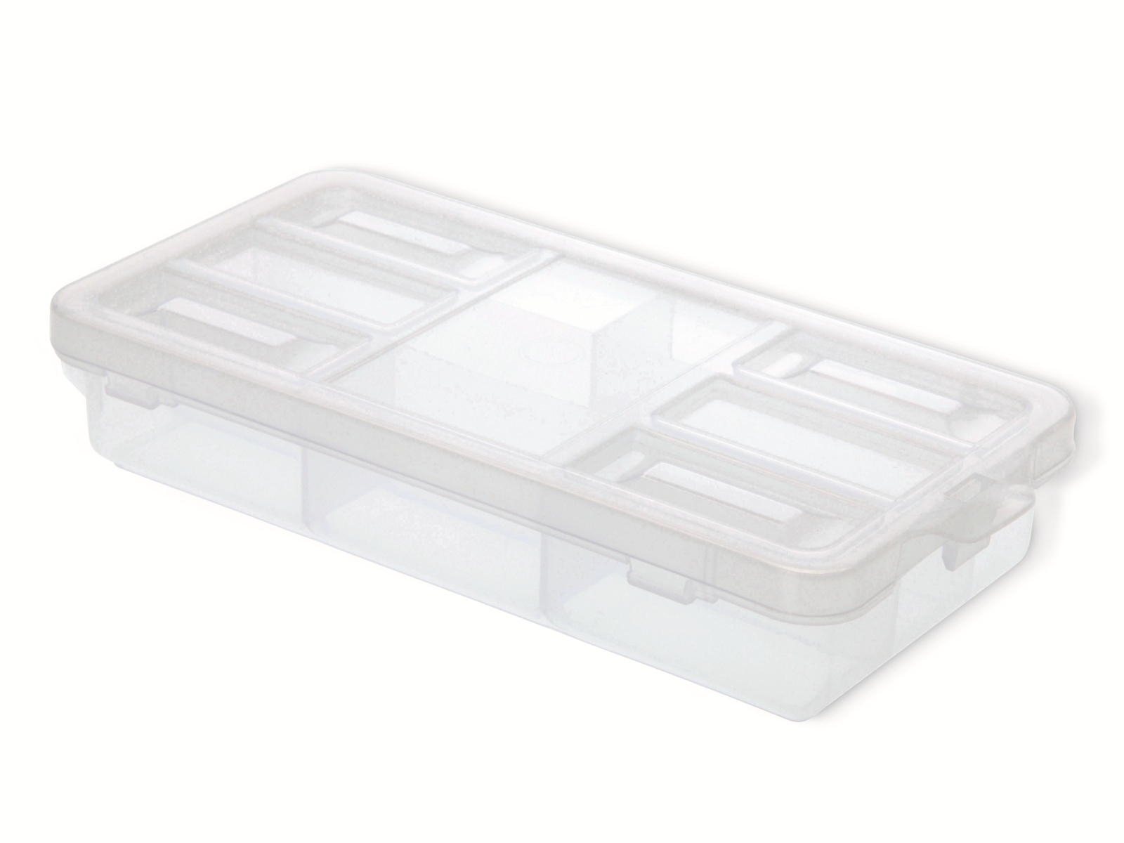 kätevä läpinäkyvä kannellinen säilytysrasia lokeroilla - mitat: 180x90x35 mm