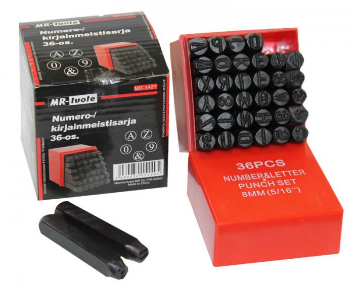 koko 8 mm (5 / 16") - 10 numeroa (6 & 9 sama) - 26 kirjainta - 1 & -merkki - materiaali 45# teräs - meistin pituus 6,5 cm
