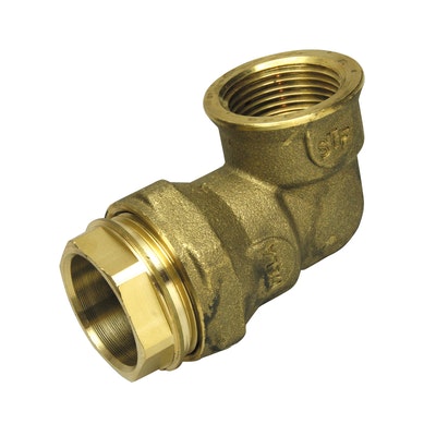 Muoviputken kulmaliitin, materiaali: erikoismessinki, koko: 1 1/4" x 40 mm, sisäkierre. Tyyppihyväksytty.