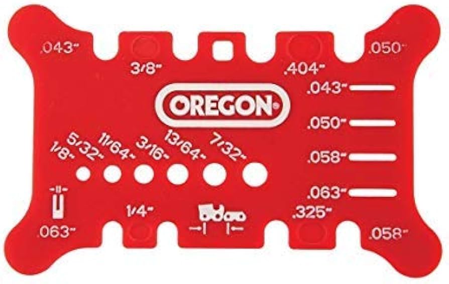 Mittatyökalu ketjun jaon ja leveyden, sahanterän uran leveyden ja oikean viilakoon mittaamiseen.