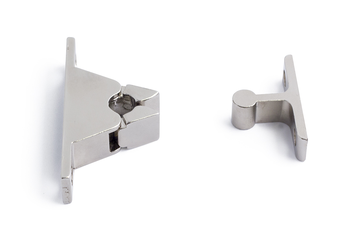 Messinkinen niklattu jousisalpa. Tarkoitettu suurempiin kaapin oviin ja vastaaviin sisätiloissa. Mukana ruuvit.
