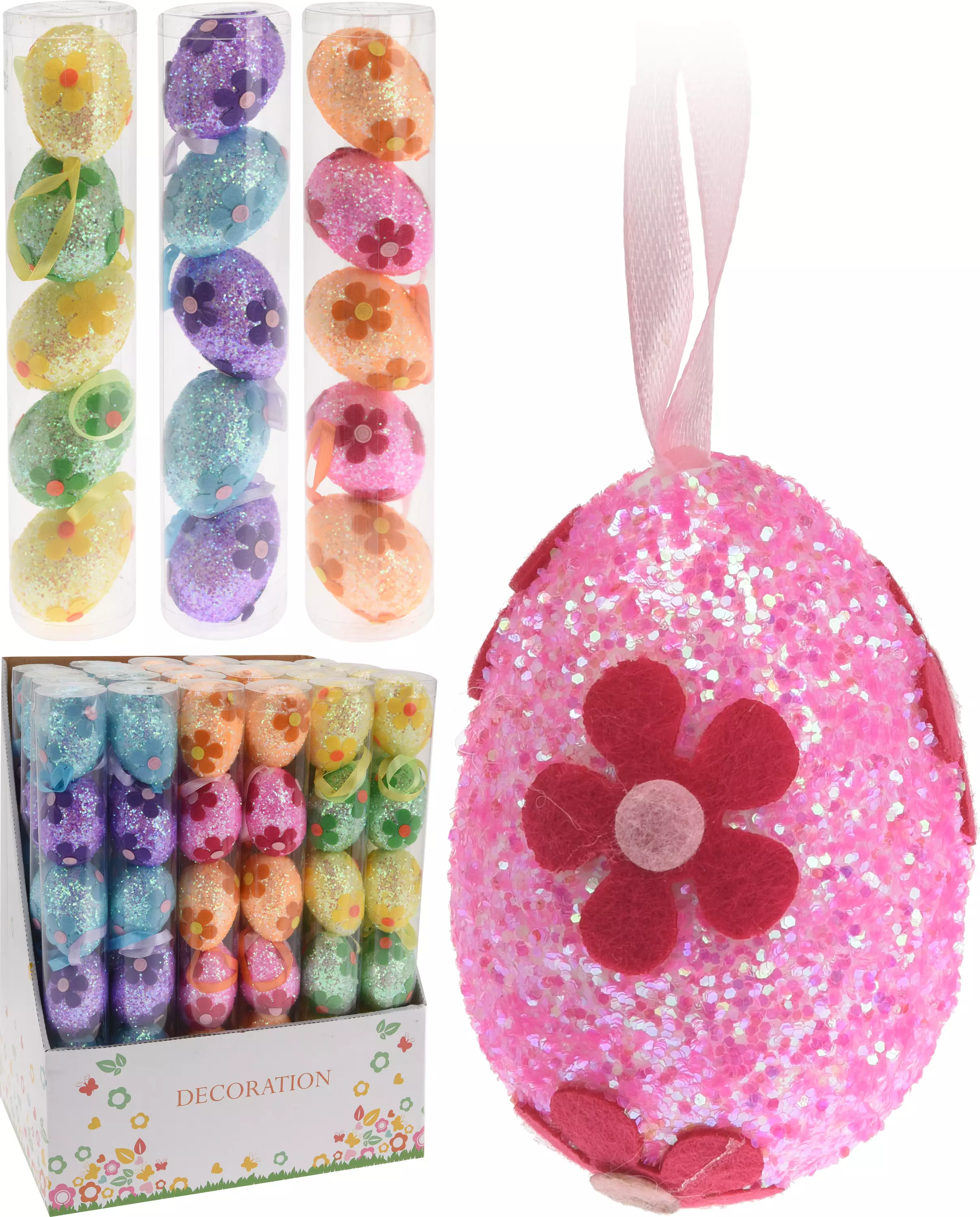 Ripustettavat värikkäät styrox-munat glitter- ja huopakoristeilla. Pakkauksessa 5 kpl. Yhden munan koko n. 6 cm.
