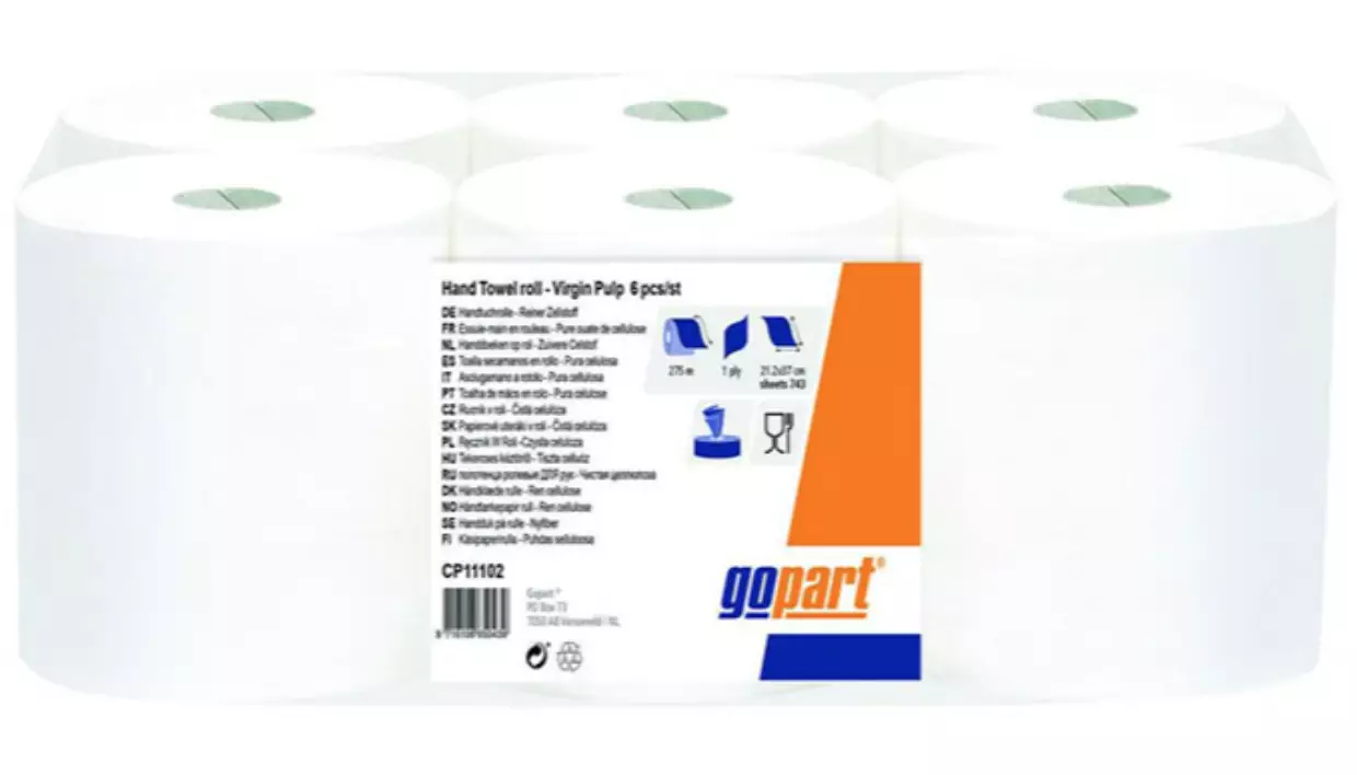 Paperipyyhe, valkoinen rulla, 21cm x 275m, 1ply, ulompi Ø200mm, kohokuvioitu, 6 rullaa.