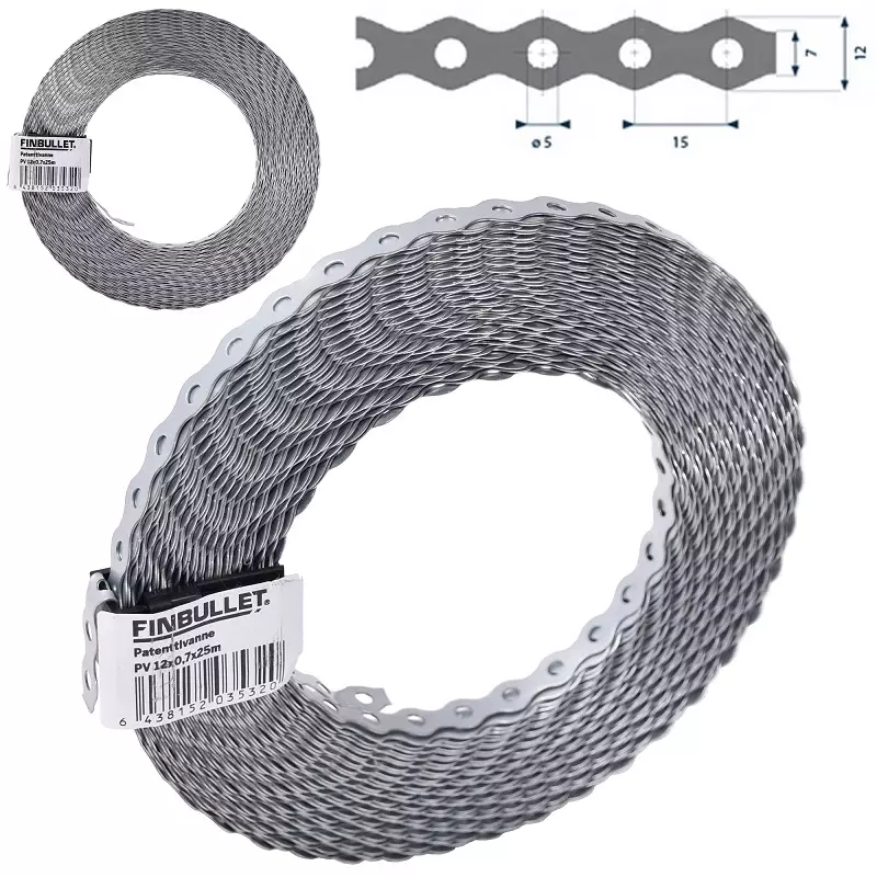 Patenttivanne 12 mm x 0,7 mm x 25 m, 5 mm rei'illä
