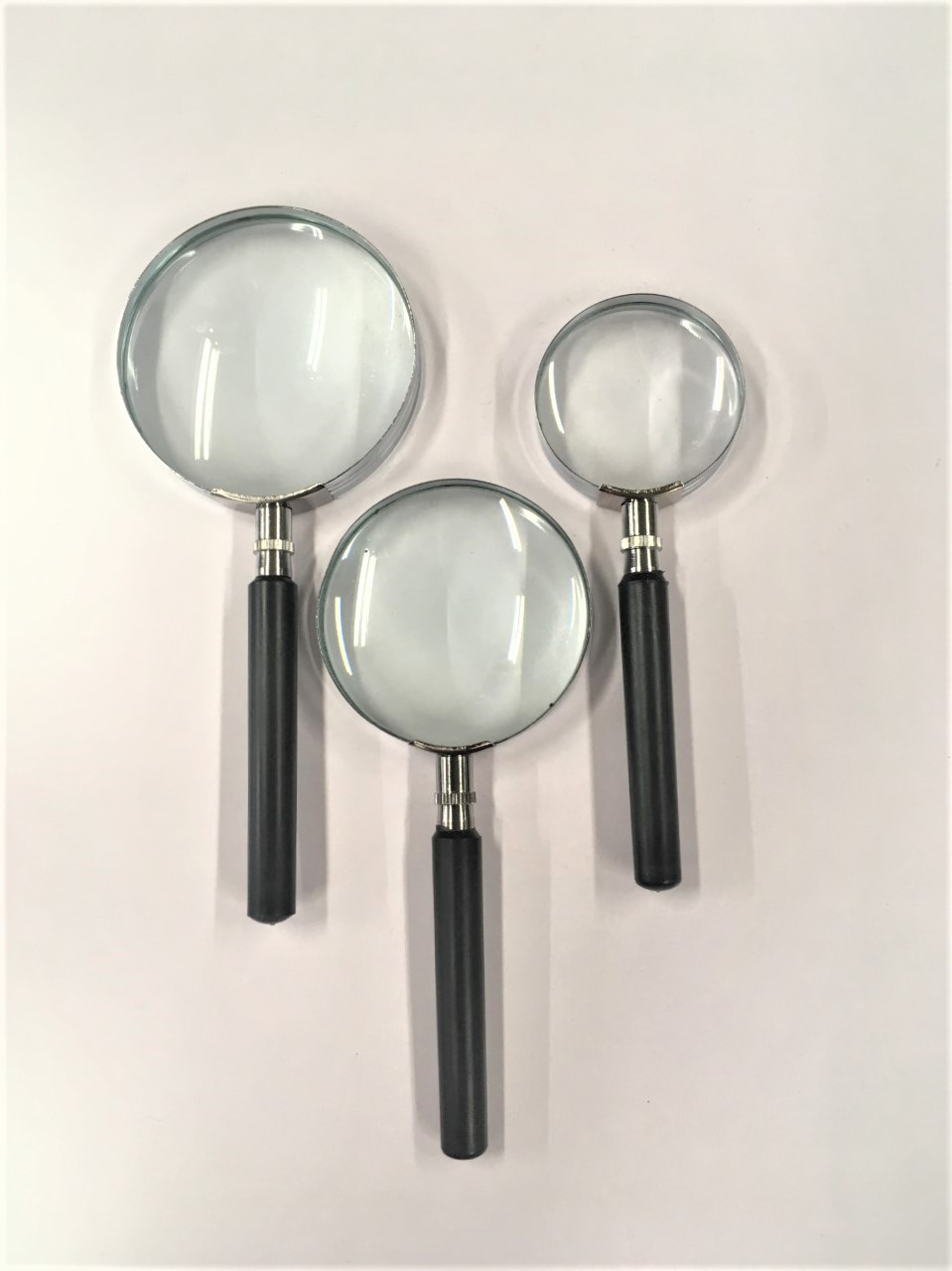 Kehys metallia, sanka muovia. Lasin halkaisija 5 cm, kokonaispituus 14,2 cm.