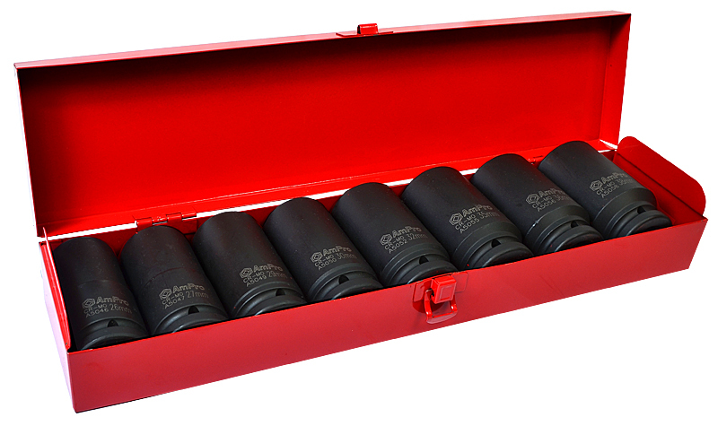 Kromi-molybdeeni-teräksestä valmistetut pitkät voimahylsyt metallilaatikossa. - sisältää 26 mm, 27 mm, 29 mm, 30 mm, 32 mm, 35 mm, 36 mm ja 38 mm hylsyt 3/4" vääntimelle - hylsyjen pituus: 90... Lue lisää