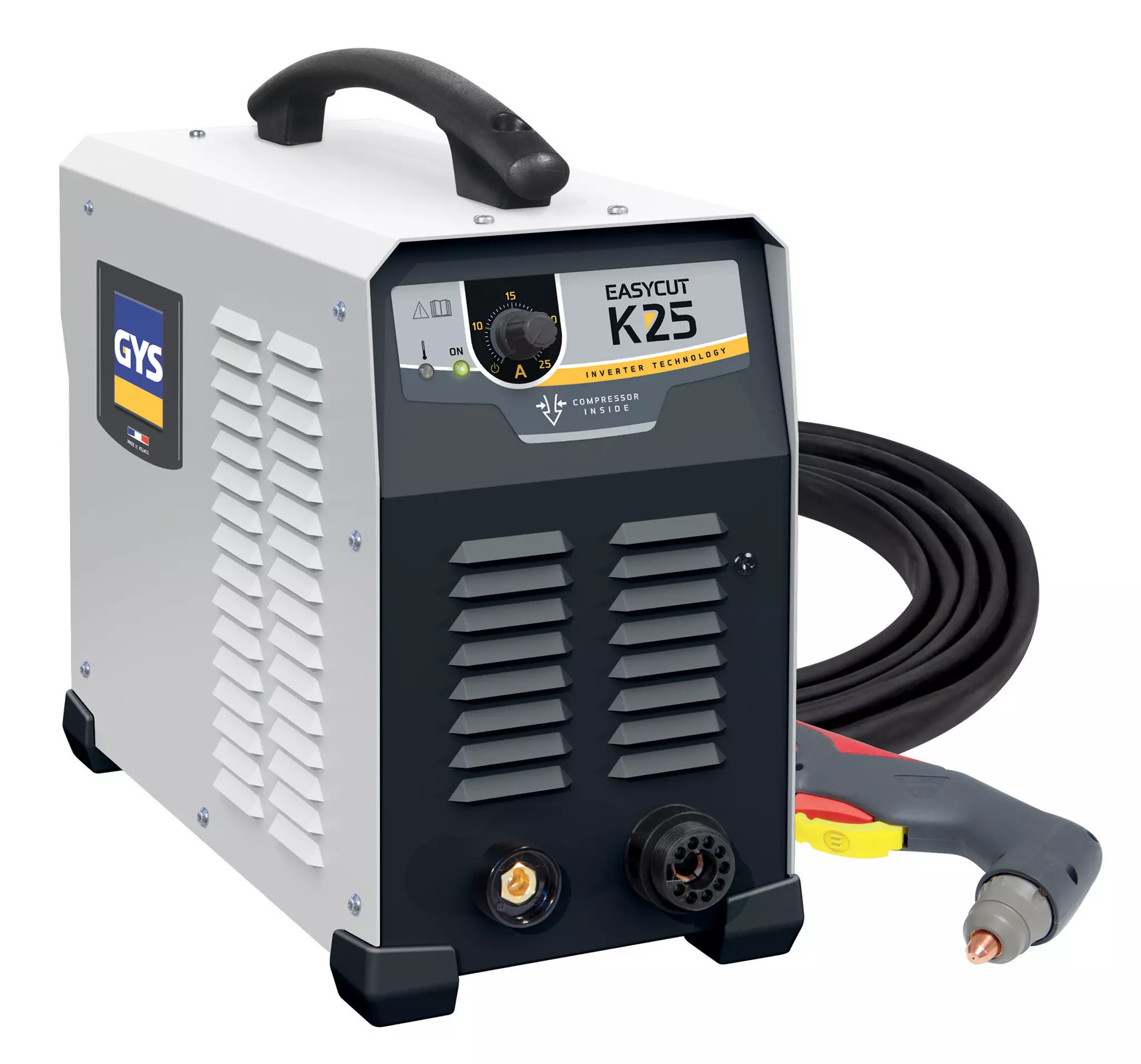 EASYCUT K25 -plasmaleikkuri, jossa on korkeataajuussytytys, leikkaa kaikenlaista metallia helposti ja nopeasti. Integroitu kompressori poistaa paineilmaliitännän tarpeen ja mahdollistaa koneen käytön kaikkialla, missä on käytettävissä vain verkkovirtaa. Se on varustettu myös "Arc Pilote" -järjestelmällä, joka mahdollistaa valokaaren sytyttämisen koskematta leikattavaan kohteeseen. Tämä käynnistysjärjestelmä, jossa ei ole suurtaajuussytytystä, estää sähkömagneettisten häiriöiden aiheutumisen radio-, tietotekniikka-, puhelin- ja lääkinnällisille laitteille sekä muulle elektroniikalle. Siinä on parannettu suojaus pysyvää ylijännitettä vastaan, ja sitä voi käyttää optimaalisesti ja turvallisesti generaattorin kanssa. Tämä plasmaleikkuri takaa erinomaisen leikkauslaadun myös maalatuilla pinnoilla.