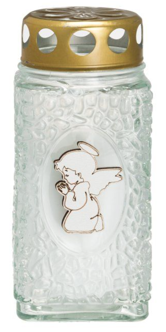 Kaunis pienikokoinen lasinen hautalyhty puisella enkelikoristeella. Koko 6 x 13 cm. Paloaika noin 18h.