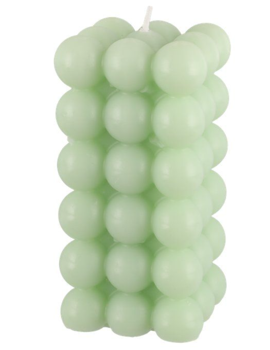 Supersuosittu ja ihana kuplakynttilä ihastuttaa iltojen hämärtyessä. - hennon vaaleanvihreä - paloaika noin 30h - mitat 6 x 6 x 12 cm - paino 0,29 kg - parafiinia