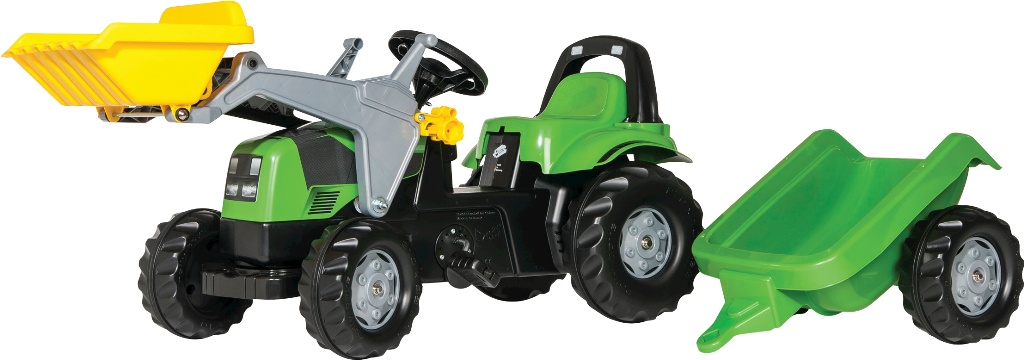 RollyKid-sarjan Deutz-Fahr-polkutraktori etukuormaajalla, perävaunulla, avattavalla konepellillä, turvakaarella ja säädettävällä ketjun kireydellä. - suositusikä: 2,5-5 vuotta - mitat (p x l... Lue lisää