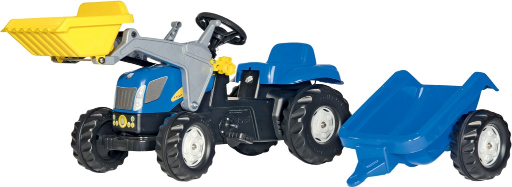 RollyKid-sarjan New Holland -polkutraktori etukuormaajalla, perävaunulla, avattavalla konepellillä ja säädettävällä ketjun kireydellä.