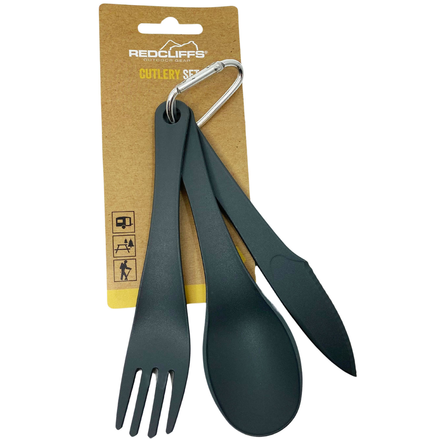kevyet muoviset ruokailuvälineet - pituus noin 15 cm - mukana kätevä karabiinihaka - lusikka, veitsi ja haarukka
