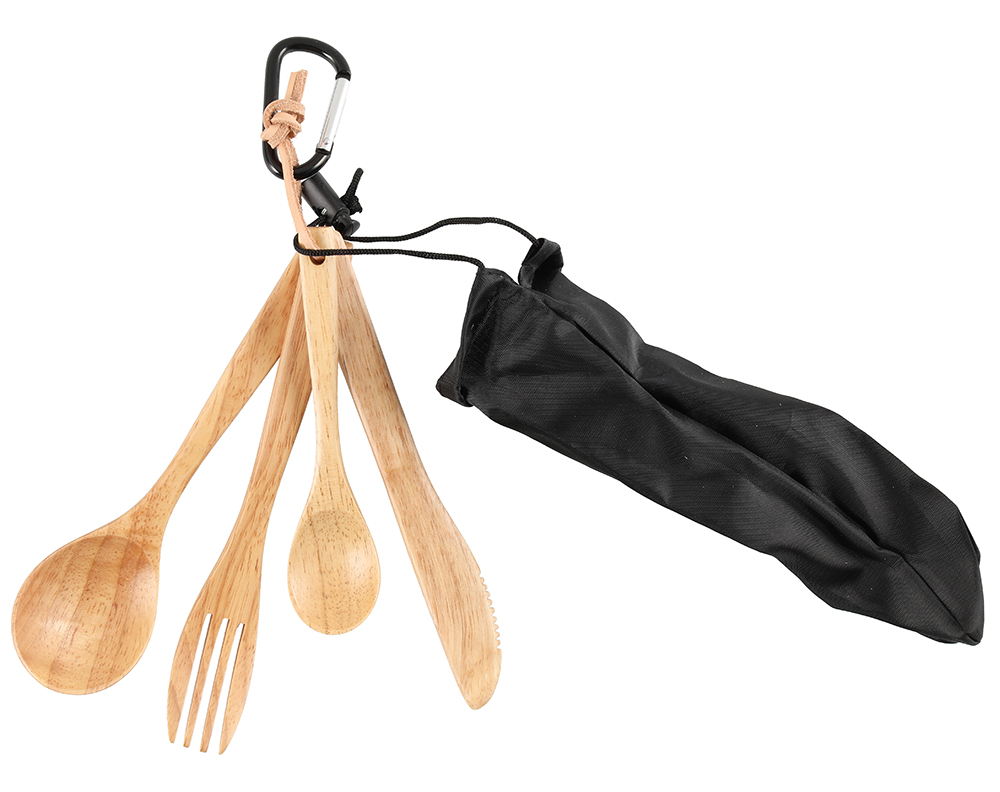 Puiset ruokailuvälineet retkeilijälle - setissä puinen haarukka, lusikka, veitsi ja teelusikka sekä säilytyspussi - mitat pakattuna: 11x3,5x29 cm - paino 0,08 kg
