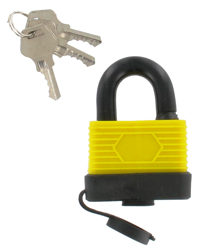 Roiskevesitiivis 40 mm munalukko jossa naarmuttamaton muovipinnoite rungossa ja salvassa. Avaimenreikä suojattu avattavalla kumitulpalla. Mukana 3 avainta. Ei jäädy eikä hapetu yhtä helposti kuin avonaiset munalukot. Sopii veneisiin, mökille, varastoihin, polkupyöriin, mopoihin ja moottoripyöriin sekä muihin kosteudelle alttiille paikoille.
