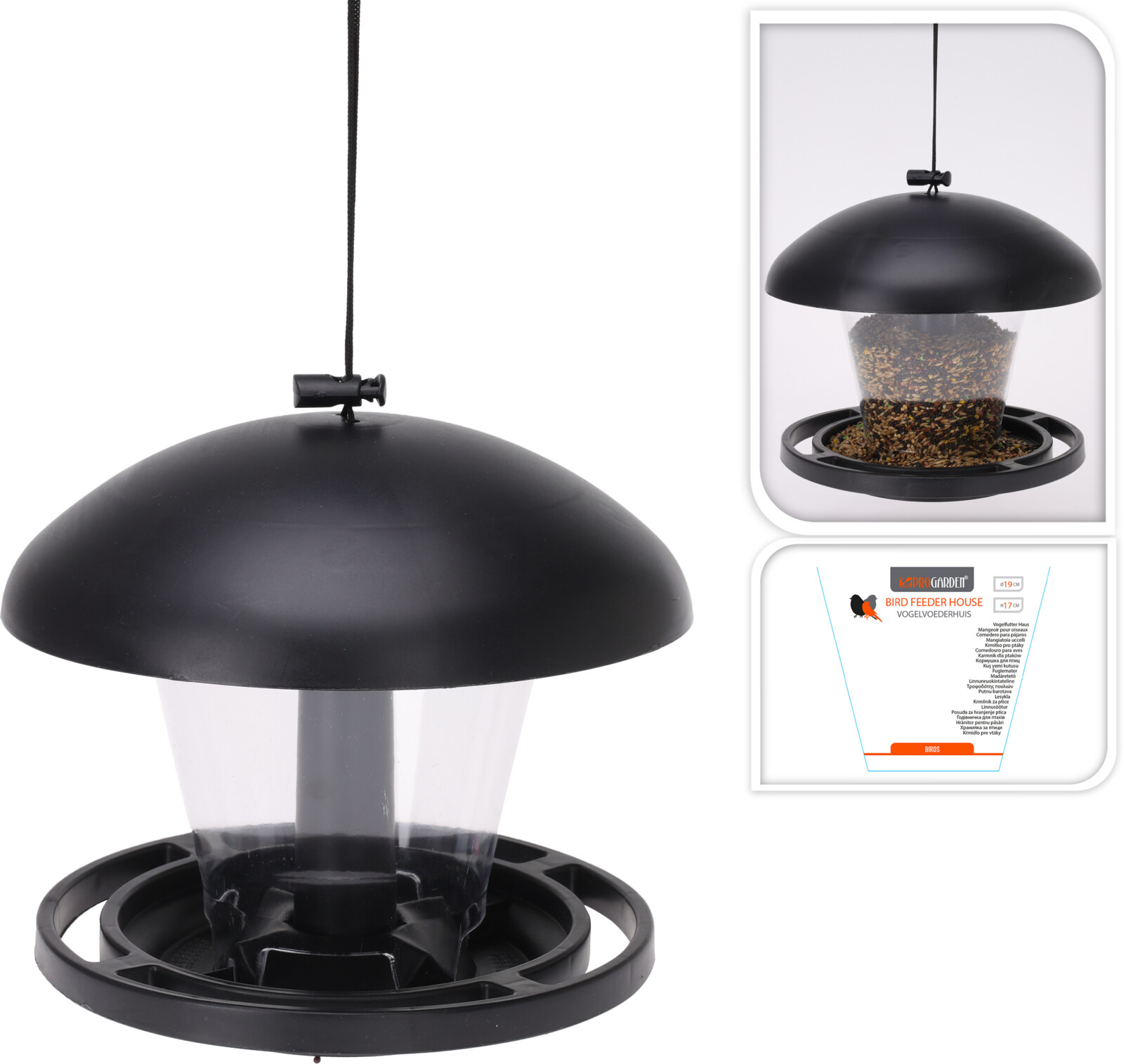 musta lintulauta ripustuslenkillä - mitat: halkaisija 19 cm, korkeus 17 cm - mustaa muovia, seinät läpinäkyvät - paino 0,188 kg