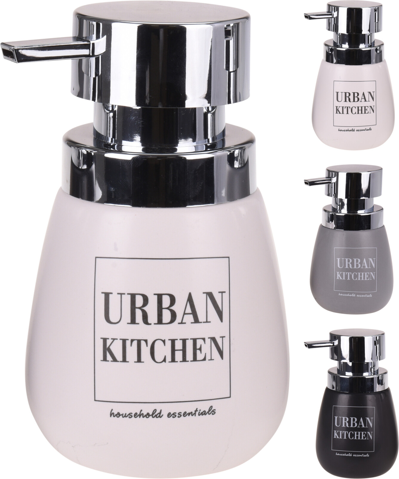 Urban Kitchen -tekstillä varustettu saippuapullo - mitat: 8,5x15cm - 300ml - materiaali: dolomiitti - saatavana värit: musta, harmaa ja valkoinen