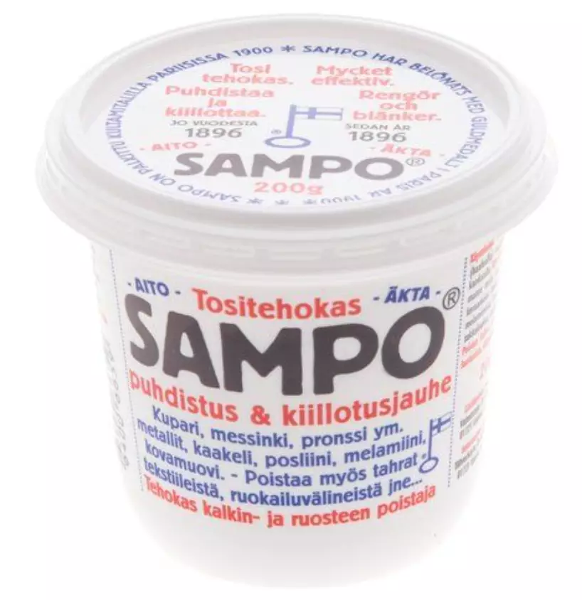 SAMPO® on Suomen tunnetuin metallien puhdistus- ja kiillotusjauhe, jota käytetään monipuolisesti niin kuparipannujen, pronssiastioiden ja metalliesineiden kuin muidenkin pintojen hoitamiseen. Se poistaa tehokkaasti, mutta turvallisesti saippuan, tiskiaineiden, kalkin ja ruosteen jättämät pinttymät sekä teräspinnoilta että esimerkiksi pesualtaista. SAMPO® puhdistus- ja kiillotusjauheella puhdistat helposti ja nopeasti: Kuparit, messingit, pronssit ja metallit, posliini-, emali- ja kovamuovipinnat, kaakelit, klinkkerit ja saniteettitilat, kahvi- ja teekupit, metalliastiat, kylpyammeet, pore- ja uima-altaat, lasikuitu- ja muoviveneet, auton alumiinivanteet (ei lakatuille vanteille). Puhdistus-ja kiillotusjauhe. Metalli, kaakeli, posliini, melamiini, kovamuovi. Poistaa myös tahrat tekstiileistä. Tehokas kalkin ja ruosteen poistaja.