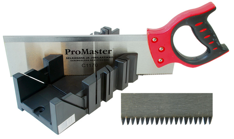 Selkäsaha 350 mm pitkällä terällä, jossa 12 hammasta/tuuma. Sahauslaatikon avulla sahaat niin 22,5°:een, 45°:een kuin 90°:een kulmaan - sopii sekä vinoliitos- että jiirisahaukseen.