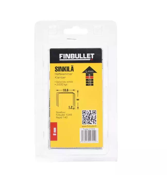 Finbullet galvanoitu sinkiläniitti 140, korkeus 8 mm, pakkauksessa 2000 kpl. Sinkiläniitti soveltuu mm. Finbullet 1049. 2706 ja Rapid 140 nitojiin. Korkeus: 8 mm. Selän leveys: 10,6 mm. Paksuus:... Lue lisää