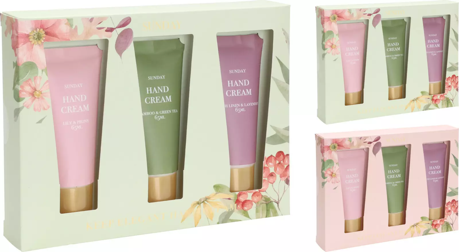 kauniissa pakkauksessa 3 kpl eri tuoksuista käsivoidetuubeja - yhdessä tuubissa 65 ml - tuoksut: Lily & Peony, Bamboo & Green Tea, Fresh Linen & Lavender - saatavana 2 eriväristä pakkausta... Lue lisää