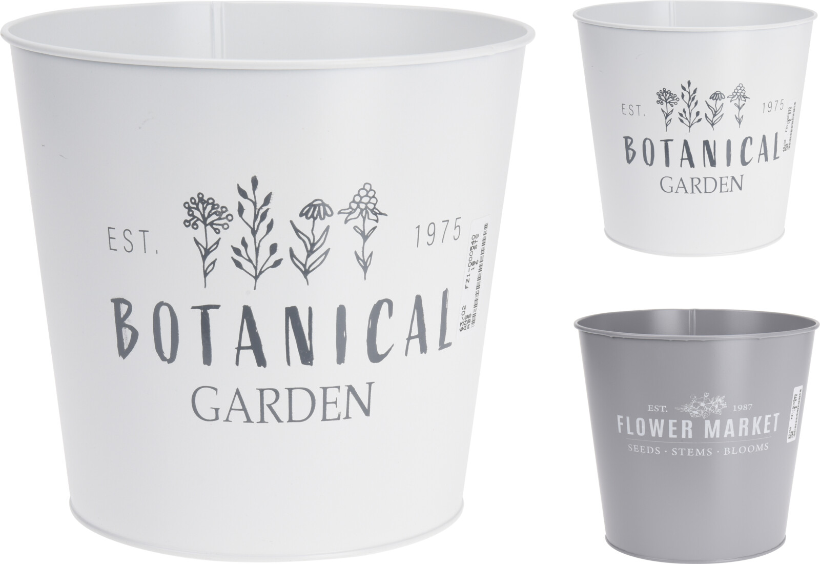 metallinen suojaruukku - korkeus 18 cm - halkaisija 15 cm - saatavana 2 erilaista: valkea "Botanical Garden" -tekstillä ja harmaa "Flower Market" -tekstillä