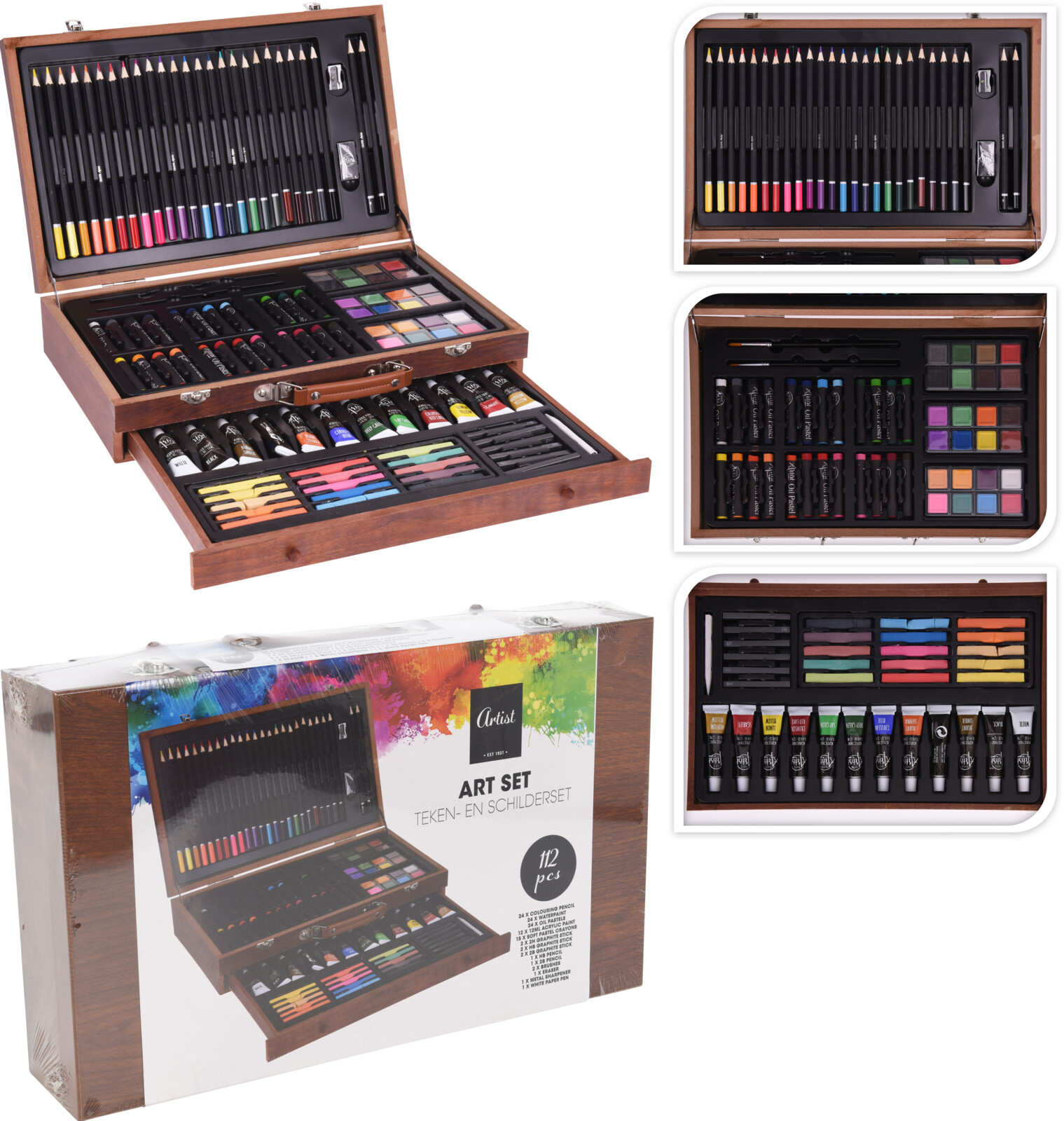 Hieno valikoima maalaus- ja piirustusvälineitä puisessa salkussa, jossa kaikki tarvikkeet ovat yhtaikaa selkeästi esillä. Pakkaus sisältää erilaisia värikyniä, hiiliä, akryylimaaleja... Lue lisää