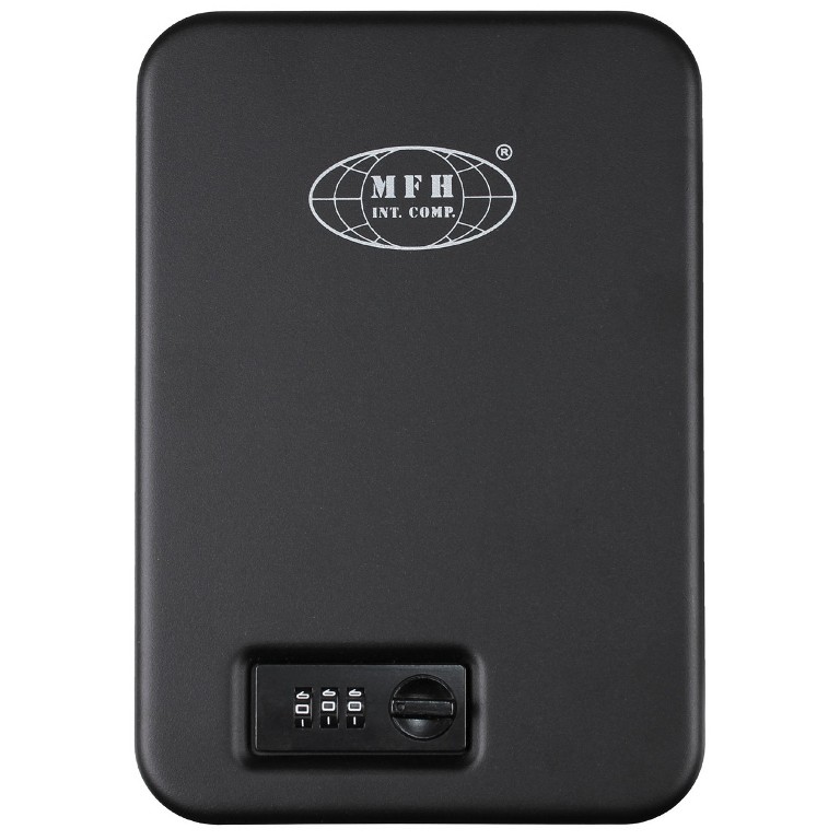 Helposti mukana kuljetettava tallelokero koodilukolla, 90 cm pitkällä teräsvaijerilla ja vaahtomuovitäytteellä. Soveltuu esimerkiksi muistikorteille, käsiaseelle, aseiden lukoille, avaimille yms.