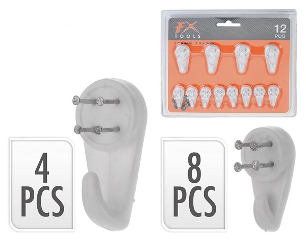 taulukoukut - setissä 4 isompaa ja 8 pienempää koukkua - muovia, väri valkoinen