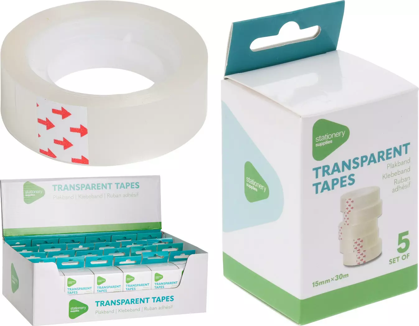 pakkauksessa 5 rullaa kirkasta teippiä - teipin leveys 15 mm - yhdessä rullassa 30 metriä