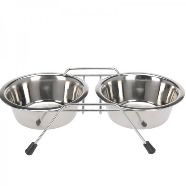 ruoka- / juomakupit kissalle, pienelle koiralle ym. lemmikkieläimille - mukana 2 teräskuppia (halk. 11,5 cm) ja teline