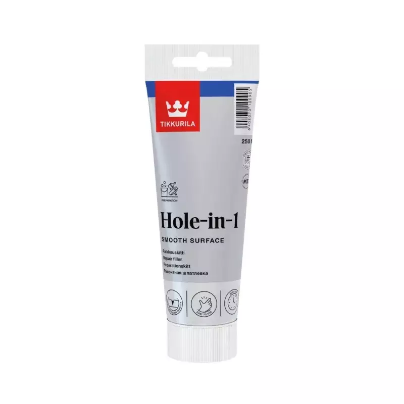 Tikkurilan Hole-in-1 on erikoiskevyt vesioheinteinen paikkauskitti koloihin, halkeamiin ja kuoppiin seinä- ja kattopinnoilla kuivissa sisätiloissa. Soveltuu erityisesti yhden kerran täyttöön. Kitti on käytännössä lähes kutistumaton, kutistuvuus on alle 5 %.