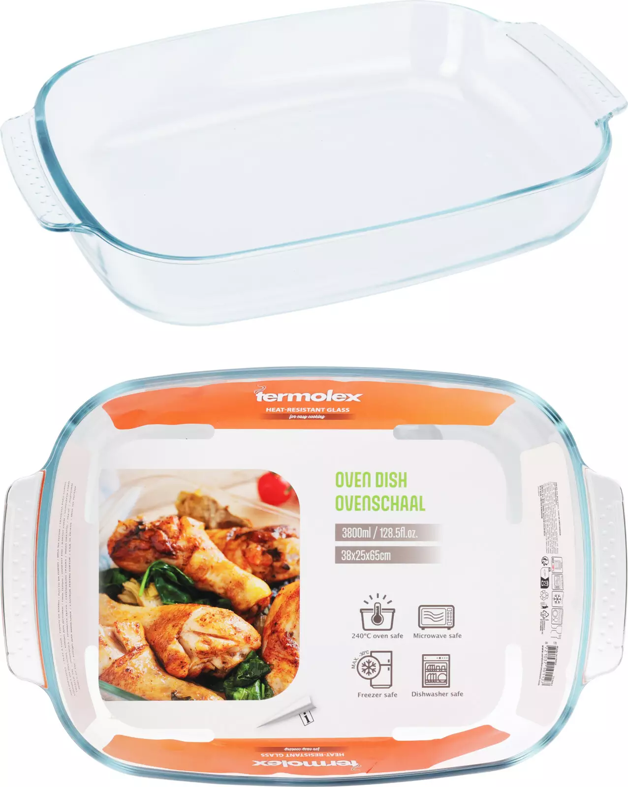 Uunivuoka paksua lasia - tilavuus 3800 ml - mitat 39 x 25 cm (yläreunasta, kahvojen kanssa) / 31 x 24 cm (pohjasta) - kestää uunin lisäksi pakastamisen, astianpesukoneen ja mikroaaltouunin... Lue lisää