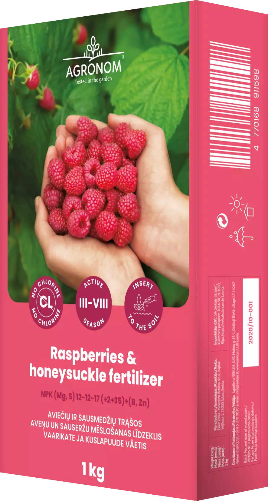 Rakeinen kloorivapaa yhdistelmälannoite vadelmien, karhunvatukoiden, kuusamakasvien, hasselpähkinäpuiden, marjakasvien ja marjapensaiden lannoittamista varten.