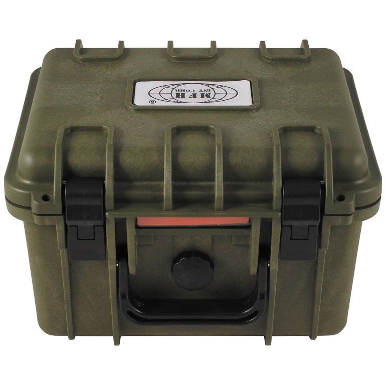 Vaahtomuovipehmustettu monikäyttöinen oliivinvihreä laatikko korkealaatuisesta iskun- ja korroosionkestävästä muovista.