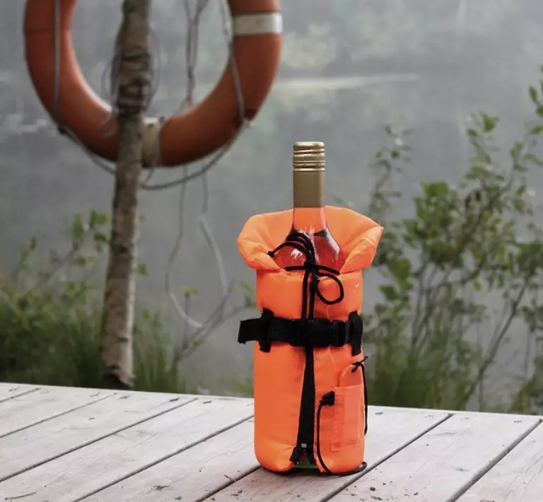Viinipullon voi laittaa pelastusliiveihin, jottei se vain hukkuisi!