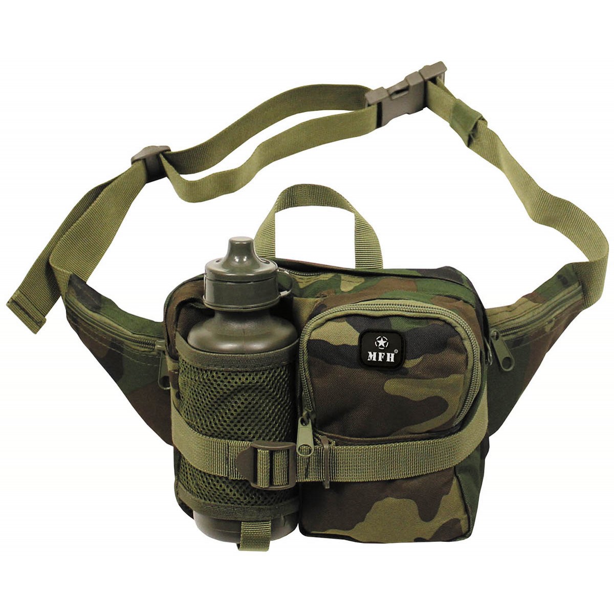 Kantokahvallinen vyötärölaukku, jossa useita erikokoisia vetoketjullisia taskuja ja yksi verkkotasku, jossa 0,5 l:n juomapullo. - väri: maastokuvioinen - vyölaukku 100 % polyesteriä, juomapullo... Lue lisää