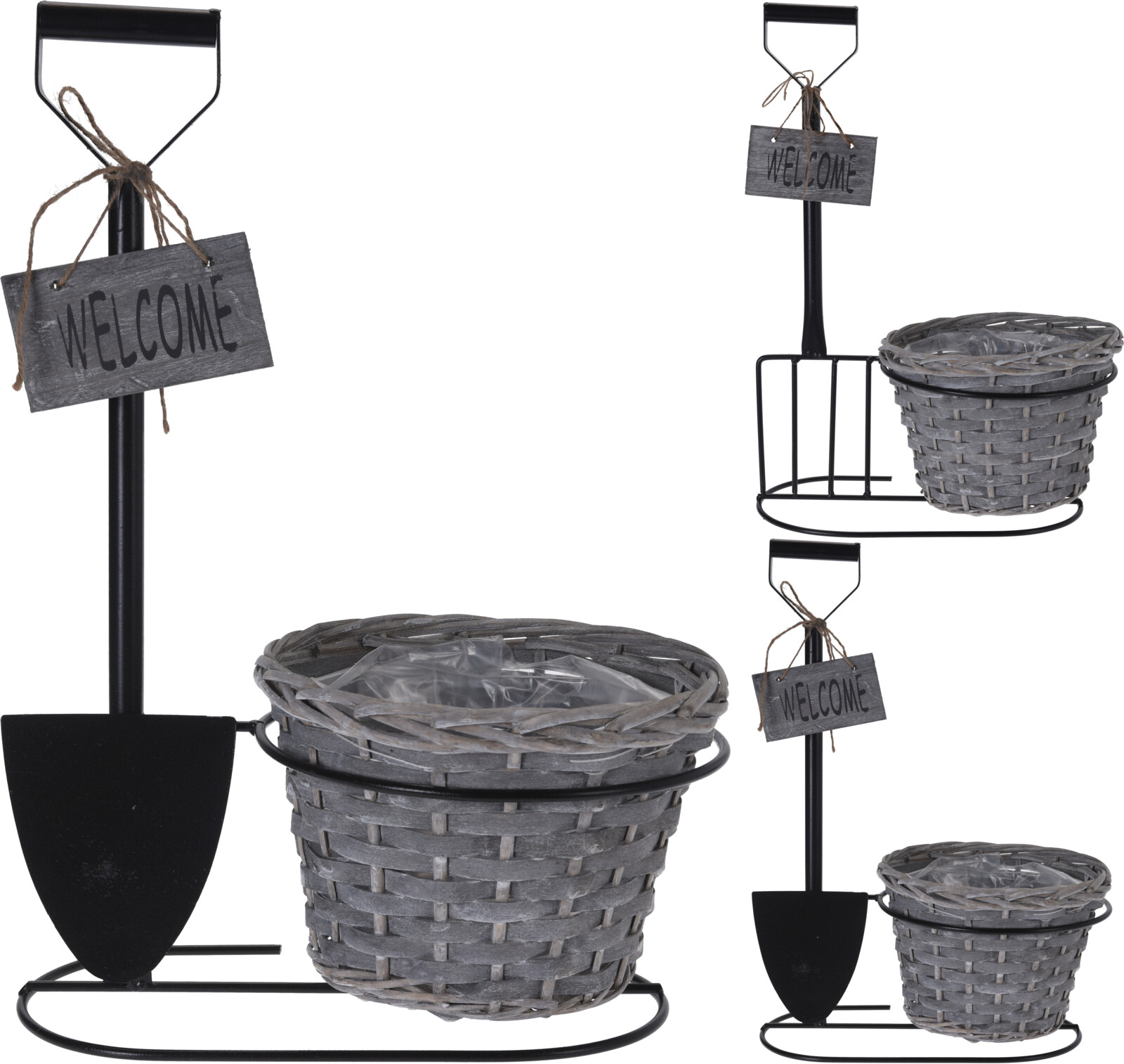 pieni harmaa kori mustassa metallitelineessä - pöytämalli, voidaan käyttää myös maassa - kevytrakenteinen - varustettu Tervetuloa-kyltillä - saatavana 2 aihetta: talikko ja lapio, joista... Lue lisää